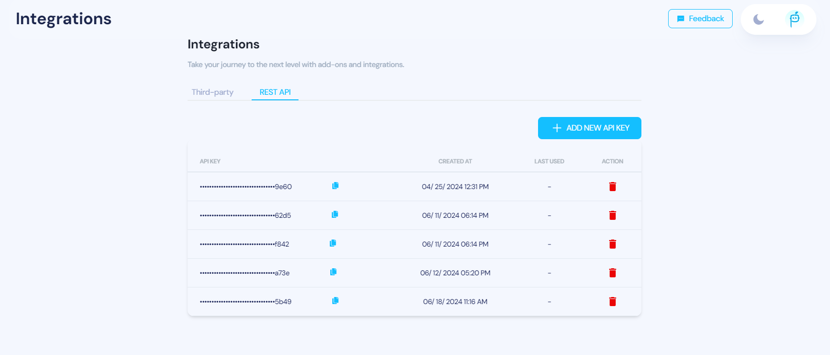 ✔ Step 1 : Open the CallMetrix dashboard. ✔ Step 2 : Click the right arrow next to the username and email in the bottom left corner. ✔ Step 3 : Select the “Integrations” option. ✔ Step 4 : Click on “Rest API”. ✔ Step 5 : Add a new API Key. ✔ Step 6 : Your new x-api-key will be displayed, which you can then copy and use as needed.